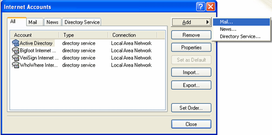 From the 'Internet Accounts' screen, select 'Add', then select 'Mail...' from the drop-down menu.